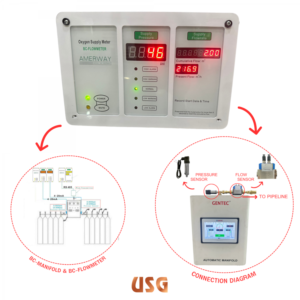 AMERWAY กล่อง FLOWMETER & ALARM สำหรับระบบราวจ่ายก๊าซ รุ่น BC-FLOWMETER